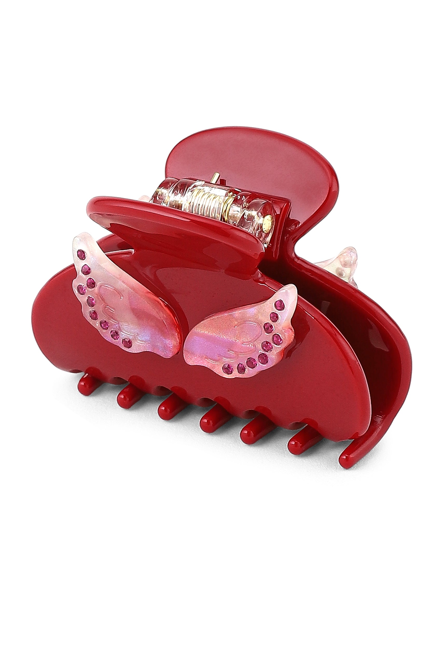 A glossy acetate hair clip in a deep rouge-red hue with a lustrous, polished finish, featuring pearlescent angel wings embellished with red rhinestones.
